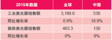 表1:2015年全球及中國(guó)工業(yè)激光器與固體激光器銷售情況(百萬(wàn)美元)