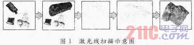0 引言 自然對象和大部分的人造對象都具有復雜的三維形狀,如何在計算機中建立三維對象的計算機模型就是三維形狀的數字化問題,該項研究源于20世紀六七十年代。三維形狀復雜多變、形狀繁多,而且其外觀、材質、顏色、用途等各不相同,這就使得三維形狀數字化的問題非常復雜,至今,該項技術尚未成熟,仍是數字化技術研究的難點。目前,三維形狀數字化技術種類很多,包括機械、聲學、光學、電磁等類型,其中運用得最廣泛、效果最好的是光學測量技術。光學測量是光電技術、機械測量、計算機技術相結合的產物,可以實現快速,準確的測量。該項技術具有速度快、精度高、非接觸、易于自動化的特點,主要適用于自由曲面的測量。目前,光學測量技術得到了越來越廣泛的應用,其中最典型的應用是三維激光掃描儀。 1 三維激光掃描儀的工作原理 三維激光掃描儀是基于激光掃描測量的原理而設計的,主要作用是對三維形狀進行數字化,基本工作原理是:線激光器發出的光平面掃描物體表面,面陣CCD采集被測物面上激光掃描線的漫反射圖像,在計算機中對激光掃描線圖像進行處理,依據空間物點與CCD面陣像素的對應關系計算物體的景深信息,得到物體表面的三維坐標數據,快速建立原型樣件的三維模型,如圖1所示。