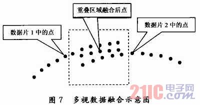 多視數據拼合包括兩個部分,第一步是將不同坐標系的數據變換到同一個坐標系中,數據片通過旋轉和平移來調整方位達到形位匹配;多視數據變換到同一坐標系后,數據片之間存在重疊區域,由于測量和變換存在誤差,重疊區域內的多重數據需要做合理的運算使其融合為單層數據。第一步是方位調整,可稱為“拼”(Registration),亦稱數據對齊,第二步是多層數據融合為單層數據,可稱為“合”(Intergr-ati-on)。將數據點集看作一個剛體,兩個數據點集的對齊屬于空間剛體移動,因此多視數據對齊問題可看作空間兩個剛體的坐標轉換,問題歸結為求解相應的轉換矩陣,移動矩陣T和旋轉矩陣R。如圖7所示是2個數據片截面上兩行數據融合的示意圖。最簡單的融合方法是中值平均,這樣會在重疊區域邊緣出現臺階。改進的方法是加權,使得融合后的數據片在重疊區域邊緣光滑過渡,但這種方法未考慮重疊區域邊緣外一定鄰域內的數據點也存在誤差。