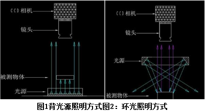 機器視覺檢測系統是通過光學系統和半導體傳感器實時自動獲取圖像,并通過圖像處理算法獲得必要信息的一種檢測系統。一般的機器視覺檢測系統包括照明系統、圖像傳感器、圖像采集卡以及圖像處理系統。近些年隨著高分辨率、高集成度圖像傳感器產業的成熟,低價格獲取高質量標準化的圖像傳感器成為容易之事,加上計算機科學技術,信息處理設備的微型化、便攜化,通過直接的“拍照”快速獲取信息的方式正逐漸深入到各行各業,尤其是批量作業、危險工作環境。光源是機器視覺獲取圖像的基礎,通過對光源的改進與設計可以高效的提取出所需目標信息,極大地提高圖像處理和識別的效率,提高系統測量精度和可靠性;反之,光源的錯誤使用則會造成圖像處理復雜度提高,系統效率低下。因此,光源是是機器視覺獲得圖像的基礎,是決定整個系統成敗的關鍵因素。 目前對于光源強度的評估都是以照度為標準,隨著光源在機器視覺系統中重要性的提升,以及光源種類和應用場合的豐富,單純的使用照度指標對不同照明方式的光源進行評估時,設計出來的光源并不能滿足實際應用的需求。基于此方面的需求,本論文提出了一種新的評估方式:背向照明應該采用亮度進行評估,并通過實驗論證了該結論。 1.理論分析: 機器視覺中評價光源質量的指標有光通量、照度、亮度、色溫、顯色性、壽命等。其中,照度、亮度都是衡量光源強度的指標,是兩個既關聯又不同的物理量。亮度:指的是人在看光源時,眼睛感覺到的光亮度,更側重的是人的感受程度。我們常說一個地方很亮而不會說很“照”,就是人的感受,指的就是這個地方的物品被照射后,反射到我們眼中的光線相對多。指定方向上光源光通量的多少是決定性因素,指定方向上光源的光通量多,亮度就高。照度:指的是光源照射到樣品上,單位被照射面積上的光通量,指的是有多少能量發射到被照的物品表面。單位被照射面積上的光通量多,照度就高。兩者的關聯是影響光源亮度及照度高低的物理量是共同的,即:光通量。不同點是:影響光源亮度的光通量,是光源表面指定方向輻射出來的光通量的多少;影響光源照度的光通量,是光源輻射到樣品上的光通量的多少。兩者表述不同,受外界影響因素也不同。同一只光源,指定方向上光源表面輻射出來的光通量、與光源輻射到樣品上的光通量是不相等的。特別說明:光源的亮度視覺感,有時受色溫影響較大。在光通量相同的光源中,色溫高的光源會產生亮度高的錯誤的視覺感。這種“高亮度”光源,光效并不一定比其它光源高,只是一種刺眼的“虛假亮”。 亮度指進入人眼中被感受到的光線強度,照度是指被照射面得到的光的數量,從機器視覺應用的照明方式來分析,背光源照明方式是相機接收到的背光源直接射入鏡頭的光線,如下圖1: