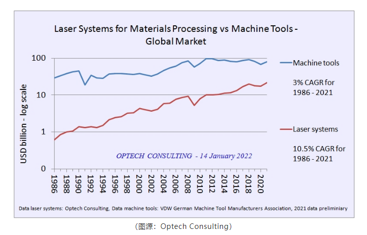 如果這一增長持續保持在個位數的高位,激光系統市場的規模將在5年內達到300億美元以上,相當于目前機床市場的30%以上。